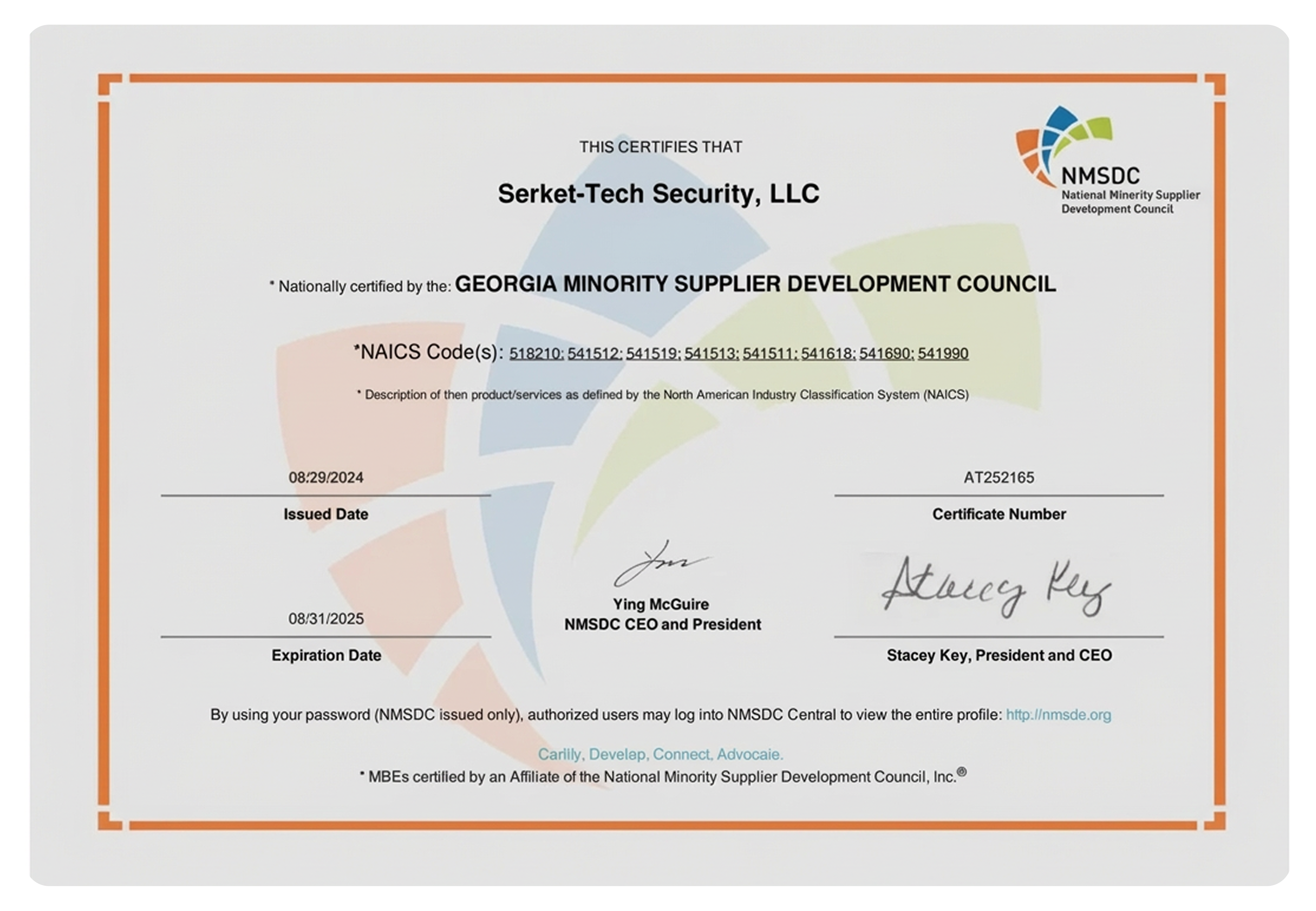 Serket-Tech Security is proud to be a certified Minority Business Enterprise by the National Minority Supplier Development Council (NMSDC). This certification reflects our dedication to delivering top-tier cybersecurity solutions while fostering diversity, innovation, and partnerships that empower businesses.
